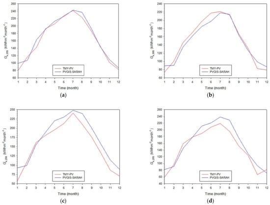 Intra-annual variation of the monthly Ge,25S or Ge,30S sums for Souda (a, PVctts zone A), Kozani (b, PVctts zone B), Chios (c, PVctts zone C), and Skyros (d, PVctts zone D). The red curves are estimates based on the corresponding photovoltaic typical meteorological year (TMY-PV) of the site, while the blue ones come from the Surface Solar Radiation Data Set—Heliostat (SARAH) 2005–2016 database using the PV Geographical Information System (PV-GIS) tool. The agreement between the two approaches is remarkable. In all cases, the correlation coefficient between the two curves is high: (a) 0.9736, (b) 0.9852, (c) 0.9679, and (d) 0.9883.