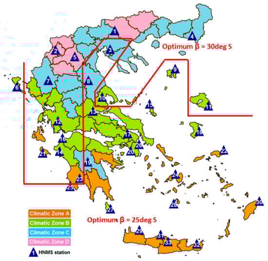 The present work provides two innovations. First, none of the studies, either in Greece or internationally, have examined the importance of the deficiency (or surplus) of the energy received between a solar flat-plate collector having a fixed tilt angle equal to the geographical latitude of its location and one with an optimum angle of inclination for maximum solar energy reception. This is served in this work for the first time. Another innovation of this work is the use of the recently derived typical meteorological years (TMYs) in Greece for PV applications at 33 sites []. “A TMY is a set of meteorological and solar radiation parameters usually consisting of hourly values in a year for a given geographical location” [,]. “More specifically, a TMY consists of a set of months selected from individual years integrated into a complete year” []. Therefore, “a TMY reflects all the climatic information of the location for a period as long as the mean life of the system” []. That study derived for 33 locations in Greece TMYs for 5 different applications: TMY-meteorology-climatology, TMY-bio-meteorology, TMY-agro-meteorology-hydrology, TMY-PV, and the TMY energy design of buildings. TMYs-PV include hourly solar radiation values on a horizontal surface. These data can be transposed to solar radiation data on various tilts with southern orientations. The latter data can be used for the investigation of the positive (surplus) or negative (deficiency) difference of the energy received by solar panels having a south-facing tilt angle equal to the geographical latitude of each of the 33 locations, in respect to the energy received by solar panels tilted at angles of 25° or 30° to the south, as these angles are found to be optimal inclinations for solar flat-plate convectors in the country. In addition, the energy received by a horizontal plane (classical reference case) is included.