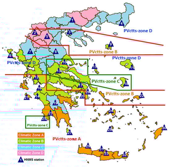 The definitions of the four climatic zones of Greece are given in Table 2, according to the technical guidelines (TOTEE) established by the Technical Chamber of Greece [], where HDD stands for heating degrees days, CDH stands for cooling degree hours, and SSR stands for surface solar radiation.