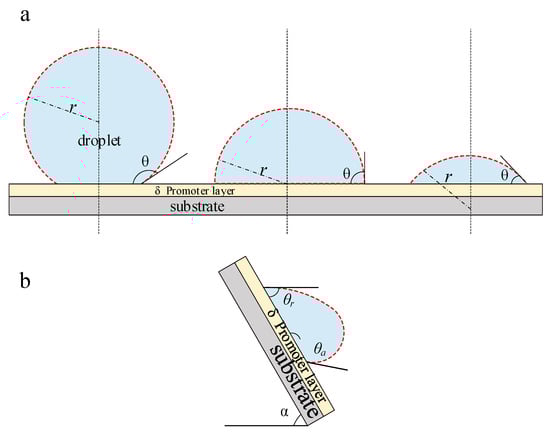 In general, the condensation forms (dropwise or filmwise) on the surface are determined by the surface’s wettability. According to the surface wettability, the surface can be classified into either a hydrophilic surface, hydrophobic surface, or superhydrophobic surface. The droplet morphology on the surface with different wettability is shown in Figure 1a, when the contact angle is θ < 90°, the surface is considered a hydrophilic surface, and for filmwise condensation, when the contact angle is θ > 90°, the surface is considered a hydrophobic surface and forms dropwise condensation []. When the contact angle is θ > 150° and the rolling angle is less than 10°, the surface is considered a superhydrophobic surface. The rolling angle above is the critical value of the angle α formed between the inclined surface and the horizontal surface when the droplet begins rolling off. When the inclined angle is less than the rolling angle, the droplet will depart due to gravity. As shown in Figure 1b, the advancing and backward contact angles get bigger and smaller. Where the is the advancing contact angle, is the receding contact angle, and the is the contact angle hysteresis.