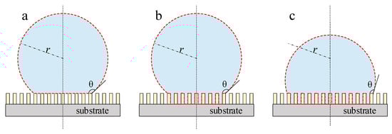 The droplets have two morphology states on the hydrophobic surface of the micro-nano structure, namely Cassie state and Wenzel state. The Cassie state (Figure 4a) occurs when the droplet is statically suspended on the structures, in which the droplets easily fall off the surface, but the thermal resistance between the droplets and the surface is larger. The Wenzel state (Figure 4c) forms when the structures underneath the droplet are completely immersed by the liquid, so the contact thermal resistance between the droplets and the surface is smaller, but the droplets do not easily fall off the surface. Miljkovic [] believed that partial Wenzel (Figure 4b) was the most favorable for heat transfer, which is the intermediate state between Cassie and Wenzel. In the condensation process, droplets will gradually deposit in the pores of microstructures, and the flooding phenomenon will occur. This phenomenon will make the droplet morphology states from Cassie become Wenzel, leading to the superhydrophobic surface losing its surface function. The properties of superhydrophobic surfaces can be regained by drying surfaces [] or infiltrating oily substances [] on the micro-nano structures surface, but all of them are palliative methods.