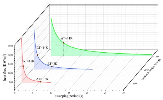 According to Kim’s heat transfer model [] mentioned above, the dropwise condensation heat flux is simulated for the contact angles of 90 deg, 120 deg, 150 deg in Figure 4. For the calculation, the following conditions were used: The vapor saturation temperature was 375 K, the nucleation density was 2.5 × 1011 m−2, and thermal conductivity and thickness of the promoter layer were 0.2 W/(m·K) and 1 μm, respectively. In Figure 5, with the increase of the sweeping time, the heat flux decreases rapidly, and the decrease rate is faster with the increase of contact angle. It is obvious that increasing the droplet shedding rate can significantly enhance the dropwise condensation heat flux for the contact angles of 90 deg, 120 deg, and 150 deg. Increasing the droplet shedding rate means that the mass transfer rate is increased and will decrease the thermal resistance due to the conduction through the drop itself. To increase the droplet shedding, decreasing the maximum droplet radius is an effective method. For the three curves in Figure 5, when the sweeping period is 5.5 s, The maximum heat flux is found on the condensation surface with a contact angle of 90 deg. When the subcooling is 11 K, the heat flux on the surface of the condensation with a contact angle of 150 deg is the largest.