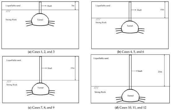 In this study, the seismic responses of a tunnel shaft during liquefaction were simulated using FLAC3D (Fast Lagrangian Analysis of Continua in 3 Dimensions) [22], which is a three-dimensional numerical simulation tool. The model system was virtually defined based on typical construction conditions of urban railway tunnels in Seoul, South Korea. The model tunnel of an urban railway (prototype) was located in the rock layer. A vertical shaft structure fabricated from reinforced concrete was rigidly installed at the top side of the tunnel body. A liquefiable loose sand layer was located above the rock layer, and the model shaft penetrated both layers vertically from the top side of the tunnel body. The primary dimensions and material properties of the tunnel shaft structure are presented in Table 1. The 12 analysis cases were composed of four depths of the base rock (5 m, 10 m, 15 m, and 21 m), i.e., thicknesses of the liquefiable layer, and three amplitudes of the input earthquake motion (500 y, 1000 y, and 2400 y), as summarized in Table 2 and Figure 1.
