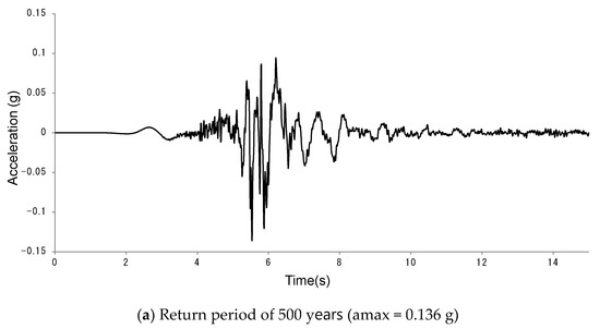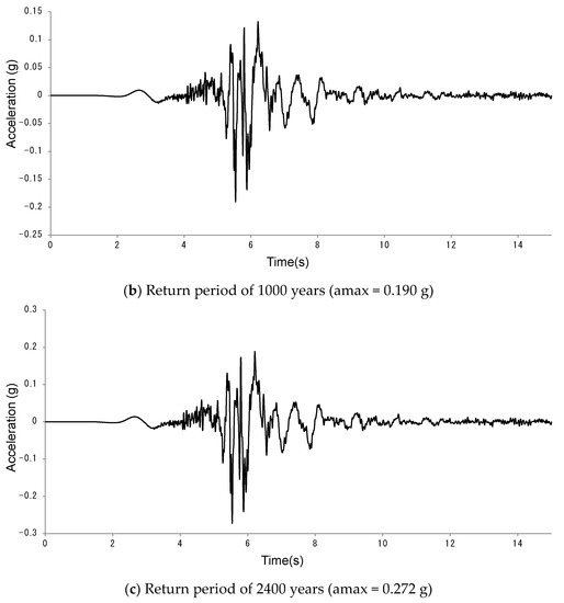 The input earthquake motion used in this study was artificially created based on recorded values from the Pohang earthquake, and the spectrum amplitude was calibrated using the Korean standard response spectrum announced in 2017. Three types of input earthquake motions were estimated according to the return period (500, 1000, and 2400 y), with maximum acceleration values of 0.136 g, 0.190 g, and 0.272 g, respectively. Input motions were induced at the bottom level of the model in the form of acceleration time histories. The profiles of the earthquake motions used in this study are shown in Figure 3.