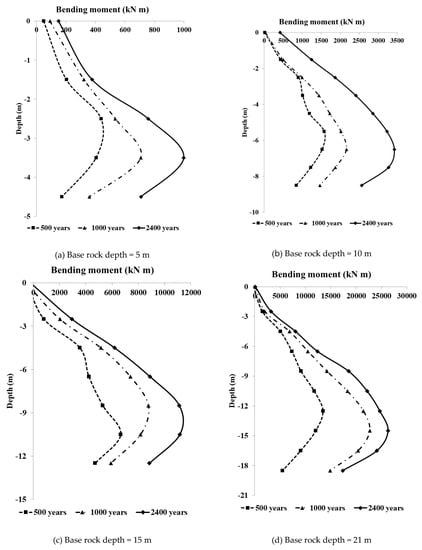 Figure 6 shows peak bending moment profiles for the shaft along the depth in each analysis case. As shown in this figure, the bending moments for the cases with longer earthquake return periods were generally larger than those for the cases with shorter earthquake return periods. The peak bending moment measured for the earthquake with a 2400 y return period was almost 2.5 times larger than that for the earthquake with a 500 y return period. In addition, the calculated dynamic bending moment increased as the bedrock depth increased. The peak bending moments for cases with a bedrock depth of 21 m were almost 25 times larger than those for cases with a bedrock depth of 5 m. This indicates that the kinematic force induced by liquefaction at deeper soil depths has a significant influence on the dynamic shaft behavior. The location at which the peak bending moment occurred was deeper than the center of the total depth. In addition, the location at which the peak bending moment occurred became deeper with an increase in the earthquake return period. This indicates that stronger earthquakes produced larger liquefied areas, and that greater kinematic force induced by liquefaction was exerted on the shaft structure.