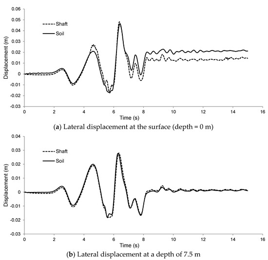 Figure 7 shows a representative graph of the lateral displacement time histories for the shaft and far-field soil. The shaft and soil behaved in-phase for the entire earthquake duration. This means that the shaft behavior was governed by the soil behavior, which was induced by kinematic interaction. In addition, the residual displacement of the soil at the surface was larger than that of the shaft. This phenomenon could indicate the occurrence of relative displacement after liquefaction.
