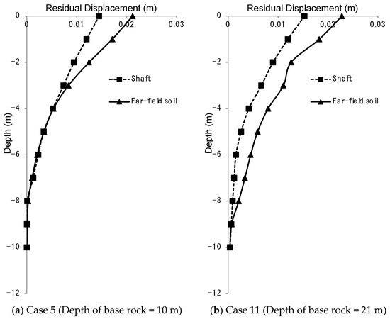 Figure 9 shows the residual lateral shaft and soil displacement profiles along the depth for Cases 5 and 11. The residual displacements of the far-field soil were larger than the lateral shaft displacements. Both residual displacements increased with the depth of the base rock. In addition, relative displacements also occurred in both cases. This indicates that a gapping phenomenon could occur between the soil and shaft after liquefaction, although the implicit value is very small.