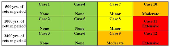 The maximum moment values from the numerical analysis are summarized in Table 8. In addition, based on the numerical analysis results, damage index values were calculated for each case using the damage states developed by Park et al. [29]. Figure 10 shows the damage index results for each case. The maximum observed moment value was lower than the cracking moment for liquefiable deposit depths of 5 m and 10 m, and no damage states were expected. However, the shaft structure with a liquefiable layer of 15 m could experience slight damage under earthquakes with return periods of 500 and 1000 y. In addition, a moderate damage state could be produced under an earthquake having a return period of 2400 y. In the case of the shaft with a 21 m liquefiable layer, the damage index values for all cases were greater than 1.4, indicating that at least moderate damage could occur in the shaft structure with deep liquefiable deposits. In particular, the damage index of Cases 11 and 12 exceeded values of 2.3, which implies that extensive damage could occur under an earthquake with a return period of 1000 y.