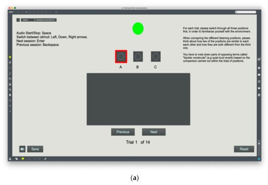 RGT Elicitation test: The RGT procedure used for the elicitation test was identical to the one used in the in-situ test, apart from the fact that the subjects could instantly switch between the stimuli for each triad and provided their responses in a text box on the test GUI (Figure 3a). Before starting the test, each subject completed a familiarisation stage where they were presented with the GUI and listened to all stimuli. As in the in-situ test, the listening test consisted of two separate stages: elicitation and construct rating for each stimulus. Subjects were required to take a short break after approximately 20 min in order to avoid listening fatigue.