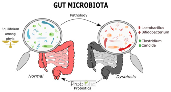 If one suffers from a pathology or takes antibiotics, the intestinal microbiota can become unbalanced, which can make the human body more vulnerable to certain infections. For certain pathologies, it is advisable to prescribe probiotics, as they can help rebuild the microbiota and position it where the disease, or even antibiotics, has broken the balance, so that the use of probiotics is an increasingly used alternative to balance and restore the microbiota [5,6]. This process is illustrated in Figure 1, in which it can be seen how an imbalance in the microbiota phyla can lead to imbalance and this can be repaired by dispensing the correct probiotic.