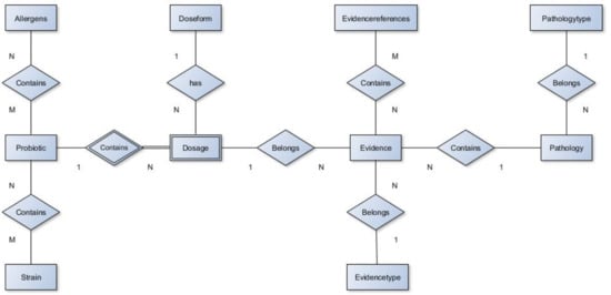 As explained above, and as shown in Figure 2, the connections defined with the letters N and M refer to the sections that can contain more than one possible coincidence, for instance, the same probiotic can contain more than one allergen or strain; meanwhile, the connections that are connected with an N and 1, will be those where there is only one possible option, as with evidence and pathology; evidence of a specific dose of probiotic with its corresponding scientific references can only be associated with a pathology.