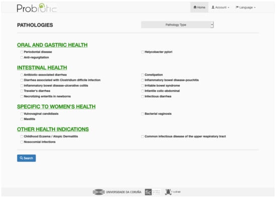 The application is organized according to the pathologies [20]. That is, depending on the problem that the patient has, a search for the right product to treat it will be carried out. Subsequently, one can see the composition of the probiotics, which are the commercial products that the professionals prescribe.