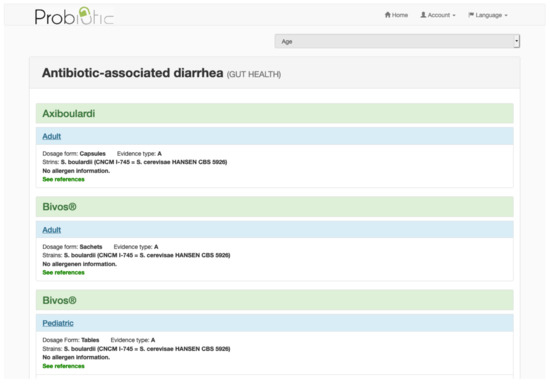 Once the pathology has been selected, the available probiotics are shown, ordered by the level of evidence, and displayed in the manner shown in Figure 4. In this case, the pathology entered in the search engine was antibiotic-associated diarrhea, so the application will show the different probiotics associated with such pathology, along with the various specifications that have been discussed, and one can also select whether it is an adult or a child, thus adapting dosage and probiotic to each case.