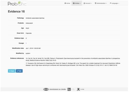 Whoever has a user role can create, edit or delete the rest of the information, i.e., information about pathologies, evidence, strains, probiotics, doses, references and all the relationships among them.