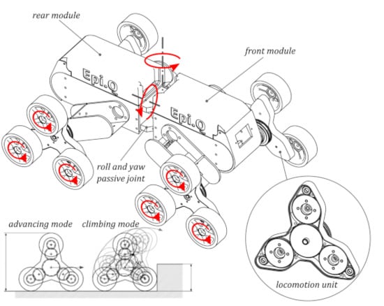 This study focus on Epi.q (Figure 1), the last model of a family of modular surveillance UGV [20]. It is composed of two practically identical modules linked together by a 2 DOF (relative yaw and relative roll rotations) joint. Its most notable feature is the architecture of its hybrid legged-wheeled locomotion unit (Figure 2): the unique design is an underactuated epicyclic gearing system driven by a single electric motor coupled to the sun gear; depending on the forces acting on the wheels and the carrier, the motor imposes a rotation motion to the wheels, to the carrier or both of them [21]. Hence, this locomotion unit enables to overcome little obstacles using the carrier as a legged rotating unit. While this locomotion unit enables interesting behaviour, during more conventional navigation, all wheels of the same unit are constrained to spin at the same speed due to the nature of the gearing system. This inevitably leads to a very evident phenomenon of large lateral wheel slip during curved trajectories, even at low speed.