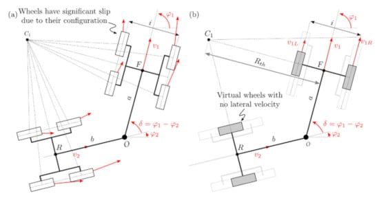 Figure 3 represents the kinematic module, where is the pose of the n-th module ( for the front module, for the back one), is the relative yaw rotation between the front and rear module, is the track of the module, and are the distances between the central joint and the front and rear modules respectively, and is the longitudinal speed of the n-th module in its reference frame.