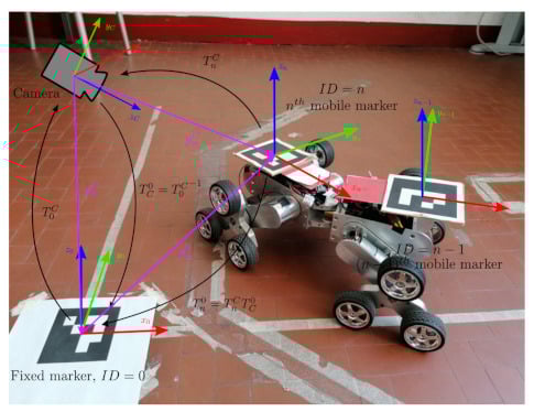 As can be seen in Figure 4, two ArUco markers, a set of open source square fiducial markers, designed for the fast processing of high quality images [24,25,26], were fixed to the robot (one per module), while one was fixed to the ground at an arbitrary location. The camera recording the tests was free to move in the environment; its position only affects the accuracy of the measure. The test recordings were then post-processed by a custom marker-tracking algorithm that first searched for a set of markers and then estimated the homogeneous transformation , a representation of the pose of the marker in the camera reference frame. The poses and of the two moving markers were then estimated with respect to the marker fixed to the ground, representing the world reference frame, by applying a concatenation of homogeneous transformations such as . With this approach, the camera can move freely, and the tracking results could still cohere to the desired reference frame. As anticipated, the camera position only influenced the accuracy of the measure, since the system used just a single camera; therefore, the picture depth estimation was noisy.