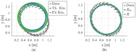 Figure 5b shows a comparison between two circles and the steady-state part of the measured trajectory: the actual trajectory is not an exact circle, but the two circles approximate it, one better than the other. Again, it appears from the results that the kinematic circle of radius is smaller and a worse approximation of the actual data than the circle with the estimated radius . This figure depicts more clearly that, if a purely steady-state comparison is made, the perfectly circular kinematic trajectories could be a good approximation of the real one.
