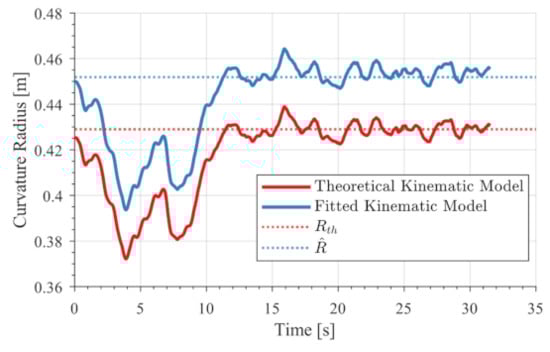 Figure 6 highlights the latter statements even better; the figure shows the instantaneous curvature radius of the two kinematic models over time, and how the two curves reach a steady-state very close to the value of the radius of the circle described before. The theoretical kinematic model tends toward , while the kinematic model with the corrected track length tends to the value of , the radius of the best-fitting circle.