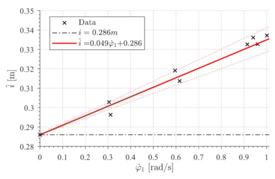 As described before, the virtual track length that better fits the experimental trajectories is always larger than the robot actual track length m to mathematically describe the under-steering behaviour of the robot that, otherwise, the theoretical kinematic model could not represent. Figure 7, in particular, illustrates that there is a strong correlation between and the front module yaw rate : the quicker the robot turns, the higher the fitted virtual length is, or, from another point of view, the quicker the robot turns, the more evident the dynamic effects on the handling, such as under-steer and wheel slip, become more relevant.