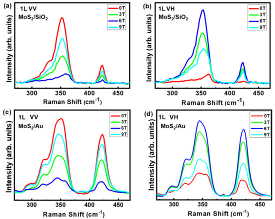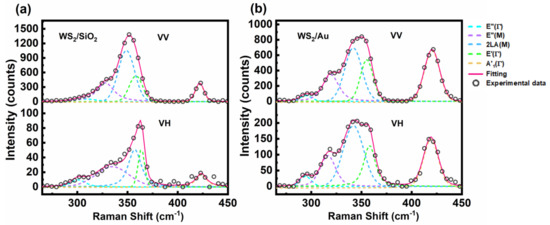 Figure 2 presents the zero-field polarized-Raman spectra of the monolayer WS2 on SiO2/Si and Au film, respectively. The Raman spectra of WS2/SiO2 exhibit obvious dependence on polarization configurations, as shown in Figure 2a. The line shape of the Raman spectra of the VV spectrum of WS2/SiO2 resumes that of monolayer WS2 in previous literature [11,30]. When the polarization configuration changes from VV to VH, the overall intensity of the spectrum is significantly weakened. After fitting with Lorentzians, five peaks are identified in the range of 250–450 cm−1 for the Raman spectra of WS2/SiO2, which is consistent with previous literature [31]. Among them, three peaks are worthy of special attention: the second-order resonant peaks involving longitudinal acoustic mode 2LA(M); the in-plane vibration mode of two S atoms in the plane in reverse motion with W atom; the out-of-plane vibration mode of two S atoms moving backward out of plane [24,32]. At VV configuration, mode is just a shoulder peak on the right side of 2LA(M) mode in the Raman spectra of WS2/SiO2. And the peak intensities of 2LA(M) and are much higher than that of E′ mode. In contrast, the intensities of the 2LA(M) and modes are obviously weaker relative to under VH configuration. The mode emerges as an isolated peak, whereas the 2LA(M) mode shrinks significantly. The polarization dependence for the Raman spectra of WS2/SiO2 follows the Raman selection rules (RSRs) for WS2 [24,33].