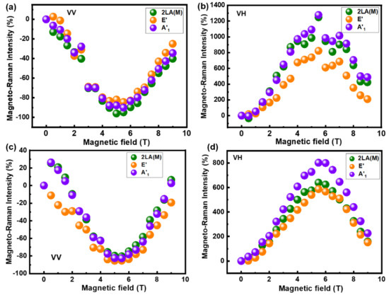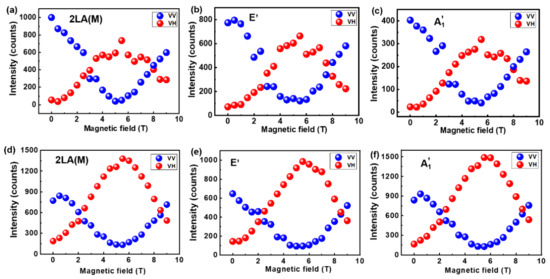 where I(B) is the Raman intensity obtained under different magnetic fields. As presented in Figure 5a, the magneto-Raman intensity of the 2LA(M), and modes for WS2/SiO2 exhibit a similar variation with increasing magnetic field, which are negative under VV configuration and reach the lowest value at around 5 T. In contrast, the VH polarization configuration witnesses the largest magneto-Raman intensity at 5 T. The VH magneto-Raman intensity of is higher than that of 2LA(M) and E′. Moreover, the lowest VV magneto-Raman intensity is nearly −100%, whereas the magneto-Raman intensity for the 2LA(M) and modes boosts to 1300% under VH polarization configuration.
