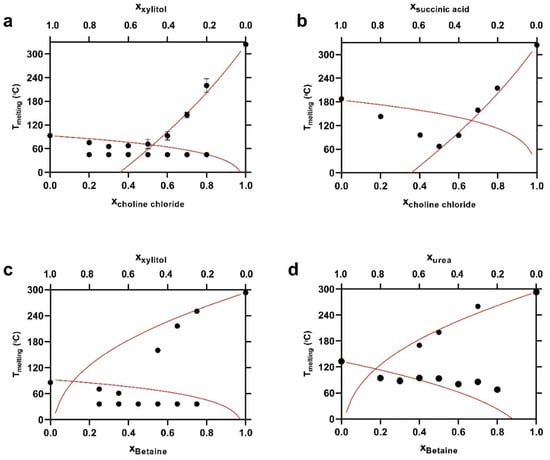 Binary phase behavior of four different DESs: (a) ChCl/xylitol, (b) ChCl/succinic acid, (c) betaine/xylitol, and (d) betaine/urea. The red lines indicate the solid-liquid equilibrium line predicted by the simplified Schröder-Van Laar equation. The experimental data points (black dots) in diagram b were adapted from Reference [17] and diagram c was from a previous study in our lab [16].
