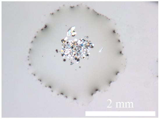 Optical light microscopy image of the deliquescence process of a betaine/xylitol 45:55 mixture at ambient conditions measured to 25 °C and 55% RH under polarized light. Remaining crystals show birefringence in the middle of the image.