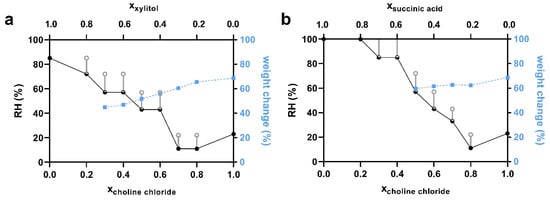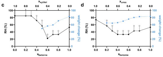 Investigating the amount of sorbed water is important to understand the relationship between moisture sorption and the RH0, and whether the systems at certain RH behaves as a DES or as an aqueous solution of DES components. The moisture sorption was investigated at a fixed RH of 72%. A relatively high RH was selected to be able to investigate a broad range of compositions. The amount of sorbed moisture was dependent on the composition seen in Figure 3 (on the right y-axis). Despite the lower RH0 for the DES mixtures, the highest sorption of moisture at 72% RH was observed for the hydrogen bond acceptors alone (choline chloride and betaine) and not for the DES. The sorbed amount of moisture was equal to a weight change of 81% for betaine and 69% for ChCl. The amount of sorbed moisture decreased across the composition range from betaine and ChCl toward higher contents of the hydrogen bond donors (urea, xylitol, and succinic acid).