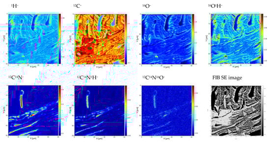 Various microscopic techniques were applied to describe the anatomical and structural composition of wood-based composites. As an example, scanning electron microscopy was used for describing anatomical structures in PBs []. However, due to the lignocellulosic nature of the samples, there is insufficient compositional contrast to distinguish clearly between wood fractions, and adhesive bondlines []. To this end, elemental mapping by means of electron dispersive X-rays might be a feasible method. However, Electron Dispersive X-rays (EDX) techniques are also limited by their spatial resolution, sensitivity, or the ability to detect and map molecules that are indicative of wood-adhesive bondlines, particularly when wood and the used adhesive are both represented by the same chemical elements, albeit different molecular clusters. Here, the alternative method Time-of-Flight Secondary Ion Mass Spectrometry (TOF-SIMS) is suggested. Lately, TOF-SIMS was integrated into focused-ion-beam scanning-electron-microscope (FIB-SEM) TESCAN instruments [], which brings additional advantages such as high spatial resolution (>5 nm) to elemental mapping, as well as simultaneous ion and SEM imaging. It was shown that TOF-SIMS (single instrument) can describe the distribution of molecules in biological systems [] and also in wood tissues [,,,], but the use of TOF-SIMS for mapping the molecular distribution in adhesive-wood phases was not demonstrated so far. Consequently, the following hypotheses are stated: