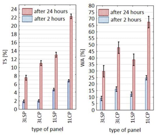 Thickness swelling (TS) and water absorption (WA) of produced particleboards (PBs). 3LCP—three-layer cup-plant PB, 3LSP—three-layer spruce PB, 1LCP—single-layer cup-plant PB, and 1LSP—single-layer spruce PB.
