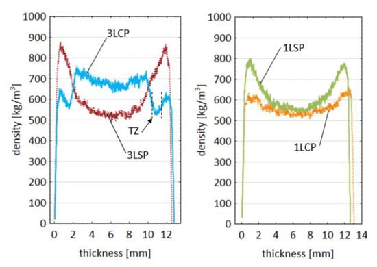 Vertical density profile of the produced particleboards (PBs). 3LCP—three layer-cup-plant PB, 3LSP—three-layer spruce PB, 1LCP—single-layer cup-plant PB, and1LSP—single-layer spruce PB; TZ—transition zone between surface and core layer.
