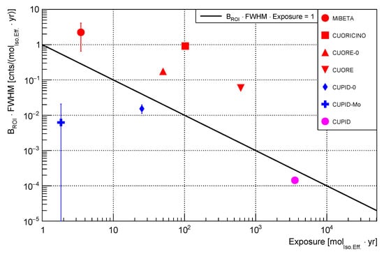 The progress in the development of cryogenic calorimeters is summarized in Figure 1, where we show for each experiment the exposure and the ROI background integrated in a detector FWHM, both corrected for the efficiency and expressed in unit of moles of the isotope under study [17]. These variables are calculated using the data in Table 1, extracted from the latest published data from the experiments. The evolution towards better performances of the CUORE precursors shows the results of the technical developments performed during the CUORE design optimization. The subsequent experiment kept increasing their mass, while continuously lowering the intrinsic background levels. Unfortunately, both the Te characteristics and the unavoidable degraded background prevented this technical approach from reaching the zero-background regime. Upgrading the CUORE design using scintillating calorimeters with dual heat–light readout will allow reaching this goal. The pilot experiments (CUPID-0 and CUPID-Mo) were able to cross this boundary, reaching world-leading performances even with small exposures. The ongoing CUPID program is the next step towards the scale-up of the scintillating calorimetric technique to the CUORE scale.