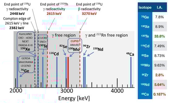 - Choosing a candidate isotope with high , in order to reduce and events from the ROI and enhance the / signal ratio;
