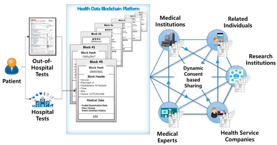 Hospital type data are created when data providers visit the hospital for a health examination. For each data, our proposed system stores encoded data, and accordingly, it has the data provider public key. Data providers have access to their own physical data and can set or change their dynamic consent rule in real-time. When other data utilizers (e.g., companies and research institutions) request for the allowed data providers’ medical data, the data source hospital confirms this request before transmitting the actual medical data to the requested data utilizer. Thereafter, the data utilizers could read the requested data. This is the key process that not only overcomes the issue of restricted health data sharing policies for some countries, but also guarantees data integrity. Note that out-hospital-data types are free from this scenario.