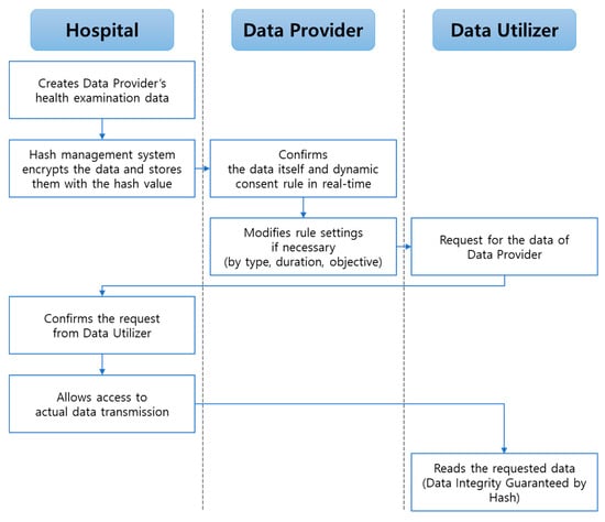 Some countries worldwide, including South Korea, still prohibit healthcare data to be stored outside certified medical institutions. Considering this, the proposed system only saves hash values of the health examination data and stores actual medical data separately in another database. Medical data’s multiple hash values are stored in the blockchain ledger so that data utilizers could read the data providers’ data based on set rules. Encoding–decoding access key to the actual medical data is, by default, managed by the data provider, unless the data provider delegates his or her authority to medical institutions where the actual database is stored. Using this mechanism, we balanced the data co-ownership ecosystem while preserving data integrity in a practical situation. This service process is shown in Figure 3. The hospital generates health an examination data of a data provider than the hash management system encrypts the data with the data provider’s public key and stores them with the hash value of the data. The data provider then confirms the data itself and dynamic consent rule in real-time and modifies the setting of the rules if necessary. The data utilizer requests for the data of the data provider, and the hospital confirms the request. The hospital allows access to actual data transmission after the endorsement process. Finally, data utilizer read the requested data through hash value comparison.