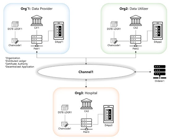 Three organizations, such as data providers, data utilizers, and hospital, form a consortium in DynamiChain (Figure 4). Mainly, data providers can set their dynamic consent rules, and we updated the chaincode according to the rules. Hospitals can store medical data transmission records and manage overall health examination data transmission. Data utilizers can compare health examination data hashes and read health examination data, respectively. The consortium is joined by all three organizations through one channel (Channel1). Additional participation on the consortium can be established through the configuration block stored in the ordering service, including peer, channel, client, network policy, and channel policy, after establishing the ordering service node, Orderer1, under consultation between organizations. Channel1 is created through Orderer1, and Channel1 provides the ability to share data only between organizations that share interests among consortiums. Organization1–3 will install their own peer in their data center and then participate in Channel1. Every peer has the role of communing/reader/anchor peer, and only the Peer3 has the role of endorsing peer additionally. The peers participating in Channel1 can store Distributed Ledger1 used on Channel1 in their local repository and share data. Chaincode1 has a smart contract function for the purpose of the Channel1 participants and is installed on every peer. Every participant on Channel1 must use our newly developed Dapp to participate in the network and send a transaction to the peers where the Chaincode1 is installed. Dapp commonly consists of a UI front end, REST API [] backend, and Fabric Software Development Kit [] (SDK, based on node.js).