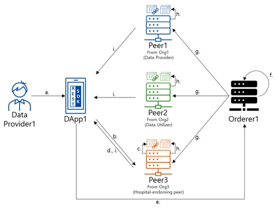 Dynamic consent algorithm is implemented in the Chaincode1, and blocks are generated throughout the following process (Figure 5). In this process, the participant called Data Provider1 in Org1 tries to send their data to the hospital in Org3 according to the dynamic consent system through the Dapp1. First, Data Provider1 requests transaction generation to send the data to the hospital via Dapp1 (Figure 5a). After receiving the transaction generation request, Dapp1 generates a transaction that contains the message of sending data and sends the transaction to the endorsing peer, Peer3. Peer3 can be connected to Dapp1 after passing the certification process using the certificate of Data Provider1. After connection, Dapp1 calls up the update function of the chaincode installed in Peer3 and requests the chaincode execution (Figure 5b). Upon receipt of the transaction from Dapp1, Peer3 simulates the chaincode by referring to the World State DB and checks the results of read/write set to determine whether it is endorsed or not (Figure 5c). If the transaction execution result is valid and the endorsement of Peer3 is passed, Peer3 sends the results and the digital certificate of Peer3 to Dapp1 (Figure 5d). Receiving the simulation results from Peer3, Dapp1 checks to see if the value of the read/write set is the same as its expected value and checks whether the digital certificate of Peer3 has been received. After verification, Dapp1 broadcasts the transaction containing the digital certificate of Peer3 and the results of read/write set to the Orderer1 node to create the block (Figure 5e). The Orderer1 identifies the time stamp fields, which is required to order the transactions, and then orders the transactions to be included in the block to create the latest blocks (Figure 5f). After that, Orderer1 delivers the created blocks to all the peers on the network (Figure 5g). Every peer who receives the latest block performs verification by running a Validation System ChainCode (VSCC) system chain code to verify the results and certificates of all transactions contained in the block. If the validation process is passed, all the peers update the distributed ledger stored in their local repository (Figure 5h). Peers complete the distributed ledger update process by sending the results of the updated distributed ledger to Dapp1 (Figure 5i).