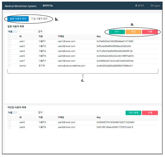 The user management system (Figure 6) manages the actual users for creating, blocking, and deleting (Figure 6a) data providers and data utilizers. Data providers can create additional accounts under a dynamic consent framework by requesting the super administrator. Data utilizers can also create additional accounts by requesting the super administrator (Figure 6b) by specifying the purpose of data usage information (e.g., clinical, research, and healthcare). Figure 6c shows the DynamiChain interface of the user management system implementation screen showing the management list according to the user type. The functions for managing the permissions of data providers and data utilizers were implemented in the super administrator account. A super administrator can create, block, and disable accounts of the data provider and user. If a user is created, a key in the blockchain is also generated. If a user is blocked, it is impossible to login to the system. The data provider sets the access permissions of the data according to the dynamic consent system. The data utilizer manages and utilizes the data according to the access permission set by the data provider.