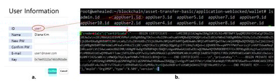 The key management system requires a key to sign the blockchain for each user. The key to the data provider is generated when he or she joins the web service (Figure 7a). The ECDSA algorithm was used to generate private and public keys. The generated keys are stored in a key-store-only wallet within the server (Figure 7b). The keys of the super administrator and the user are distinguished. For security purposes, each user maintains the key in a separate wallet.
