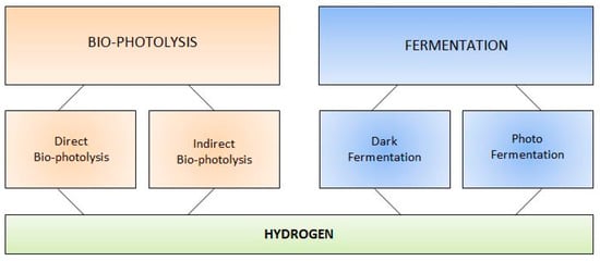 Among renewable options, hydrogen shows the important advantage of CO2-free combustion, with water as a by-product. Thermodynamic properties, compared to traditional fuels, confirm the interest in its investments in research, although several aspects related to production and storage are still to be mastered. Today, several industrial applications depend on hydrogen, but the most is obtained by techniques, such as steam reforming or electrolysis, not entirely free from the involvement of fossil fuels [5]. Some living organisms, such as microalgae and bacteria, are the basis of processes capable of producing hydrogen in a completely eco-sustainable way. Microalgal hydrogen production is made possible by biological processes directly or indirectly, depending on sunlight, or by fermentation processes and thermochemical technologies for biomass conversion (Figure 1).