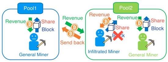 In addition, the existence of multiple mining pools causes another problem, i.e., the Block WithHolding (BWH) attack [21,22], where pools can inject part of their hash/mining power to other pools to obtain additional revenues while not contributing to the mining process of the attacked pools. Figure 1 illustrates the details of the BWH attack in the case of two pools, where one pool (say Pool 1) attacks the other (say Pool 2). Suppose Pool 1, i.e., the attacking pool, dispatches some of its miners as spies to Pool 2, i.e., the attacked pool. When the spies find full PoWs (FPoWs), they discard them, while they still report PPoWs to the manager of Pool 2. In this way, the spies can obtain revenues/rewards from Pool 2 by reporting PPoWs, while they actually contribute nothing to the mining of Pool 2. The revenues of the spies can be sent back to Pool 1, which will be re-distributed to the miners in Pool 1 including the spies. The study in [23] shows that a pool can obtain more revenues by launching the BWH attack to other pools.