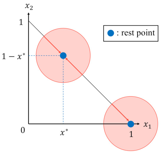 Generally, ESSs are NEs, while NEs are not necessarily ESSs. Thus, we need to analyze the stability of NEs to identify the ESSs of the game. Again, we interpret the population states as mixed strategies. Suppose the entire population adopts the strategy and there is another mutant strategy that attempts to invade a fraction of the population. If the following inequality holds, then is an ESS: