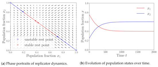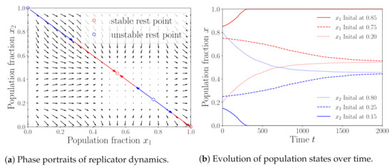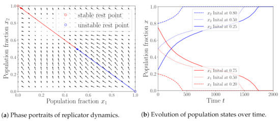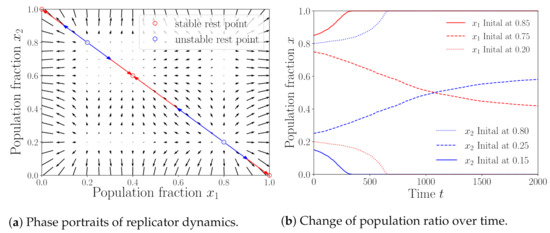 According to (10), the equation system of the ODEs for the replicator dynamics can be expressed as follows: