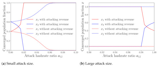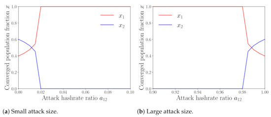 We proceed to investigate the impacts of attack size on the stable population states, for which we fix the initial population state at . Figure 5a,b show the simulation results for small attack size (i.e., in the region ) and large attack size (i.e., in the region ), respectively. From Figure 5a, we can see that as the attack size increases, the population of the attacking pool (i.e., pool 1) increases, while that of the attacked pool (i.e., pool 2) decreases. The results show that using more hash power for BWH attack attracts more miners to join, when the attack size is small. However, this is not the case when the attack size is sufficiently large, as shown in Figure 5b. We can see from Figure 5b that, for the case of the large attack size, the population of the attacking pool decreases as the attack size increases, while that of the attacked pool increases. The reason is that the larger the attack size is, the less hash power is used for mining, leading to decreased mining revenue, which dominates the trend of the total revenue of the pool. This indicates that devoting too much hash power for BWH attack may discourage miners to join the attacking pool. Similar observations have also been reported in [25].