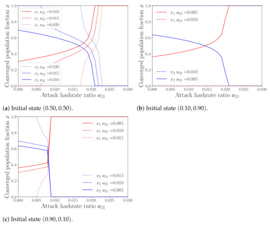 Next, we investigate the impacts of attack sizes and on the converged population states. Figure 9 shows how the stable population state changes when the attack size of pool 1 () increases from 0 to under various values of the attack size of pool 2 (). In Figure 9a, the initial state is fixed as and the attack size of pool 2 is set as . This figure shows that, as the attack size of pool 1 (resp. pool 2) increases, the stable population fraction of pool 1 (resp. pool 2) increases. This means that using more hash powers for attack will attract more miners to join the pool after convergence. Furthermore, we can see that when the two pools use the same attack size, the populations converge to nearly the stable state without attack , which means that attack has no impacts in this case. The results with initial states and are also shown in Figure 9b,c. We can see the same phenomenon from these two figures that mining pools can attract more miners to join after convergence by increasing their attack sizes, implying that attack can give mining pools advantages.