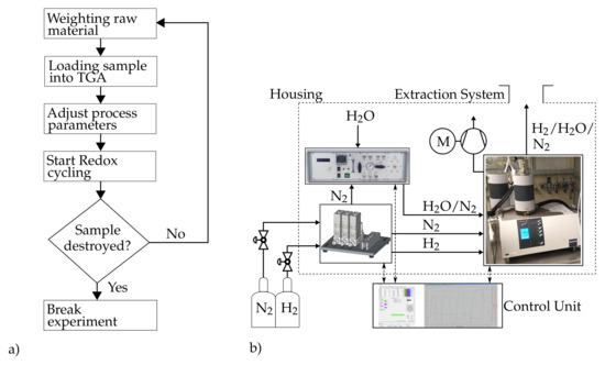 (a) Flowchart for the experimental procedure; (b) TGA setup for the experimental investigation of the kinetics of the redox reactions.