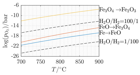 Equilibrium partial pressure of oxygen in H2O/H2 mixtures as a function of temperature (dashed lines) compared to the dissociation pressures of the different iron oxide reactions (solid lines) (calculated on the basis of [42]).
