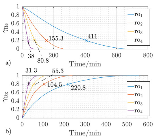 During the test campaign (see Figure 2), the reaction kinetics were measured at the gas mixture flow rates of . The molar concentration of the reducing and oxidizing gas mixtures was changed according to Table 2 for the different redox runs (ro–ro).