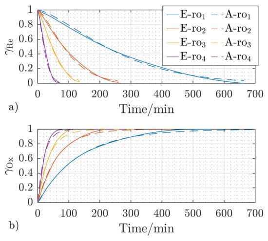 The comparison between the experimental (E-) and analytical (A-) reduction and oxidation results is shown in Figure 6a,b. A very good agreement between the mathematical model in Equations (8) and (9) and the experimental results is achieved, which is indicated by an average deviation of less than 3%.